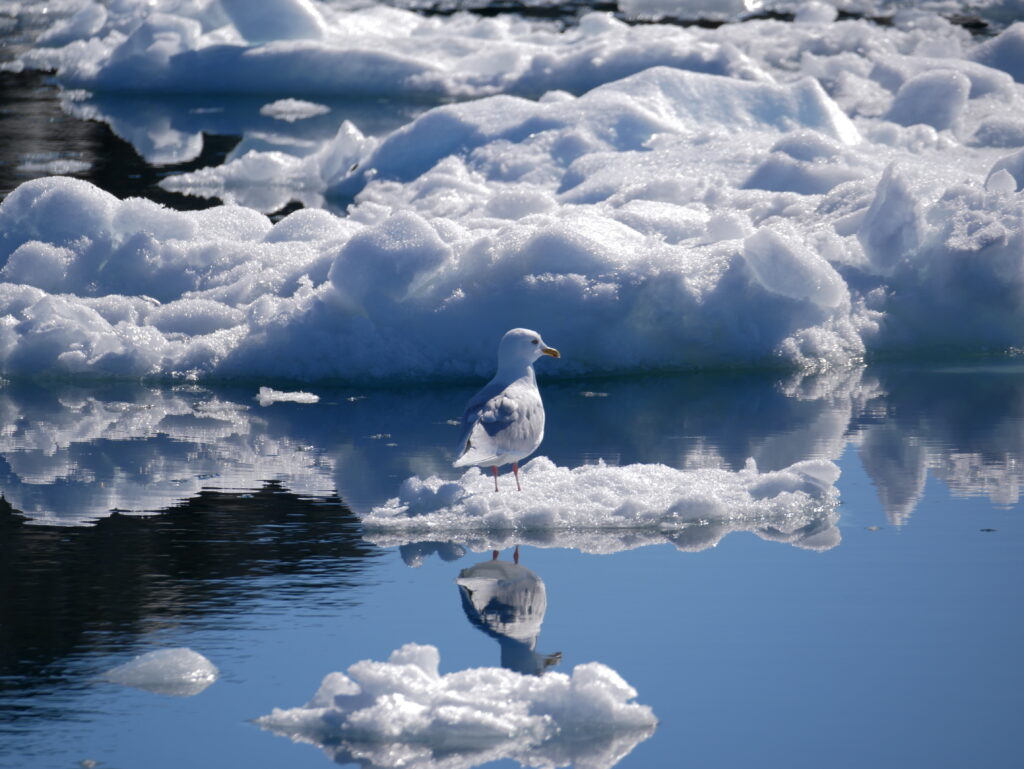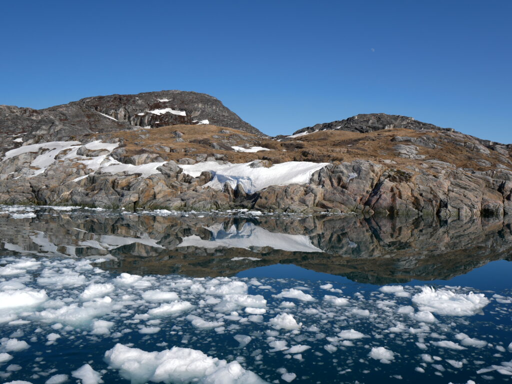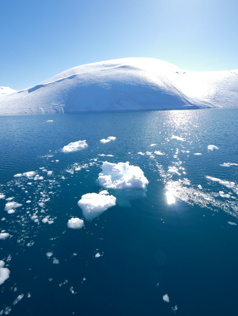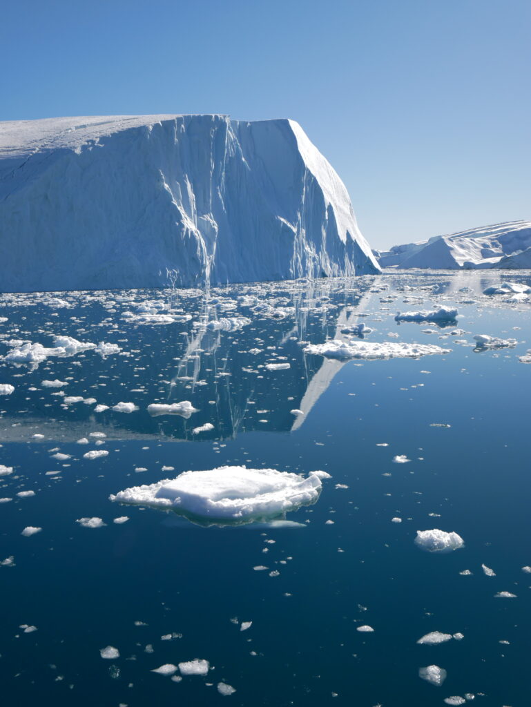 Isbjergene spejler sig smukt i det mørkeblå hav.