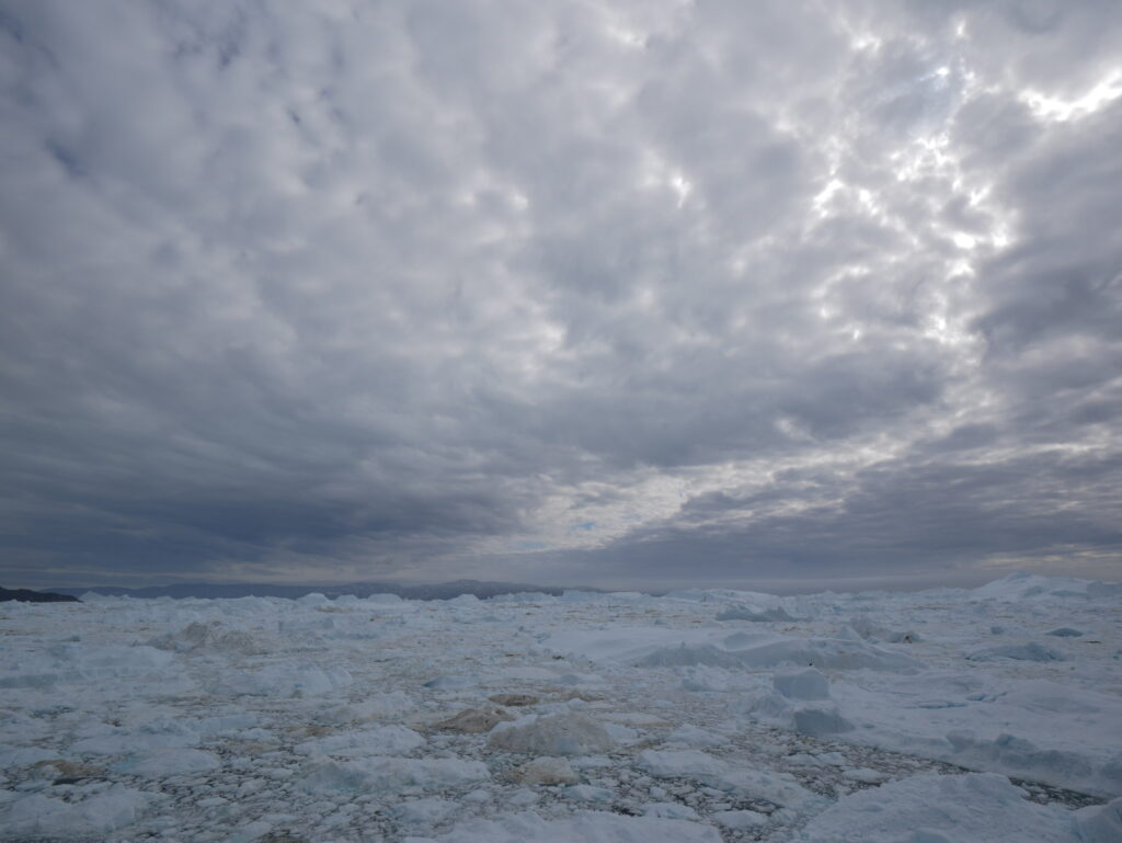 Isen inde i isfjorden er tæt pakket bag de stor isbjerge.