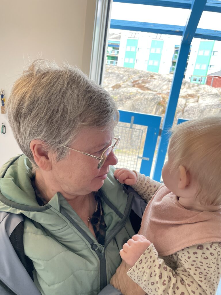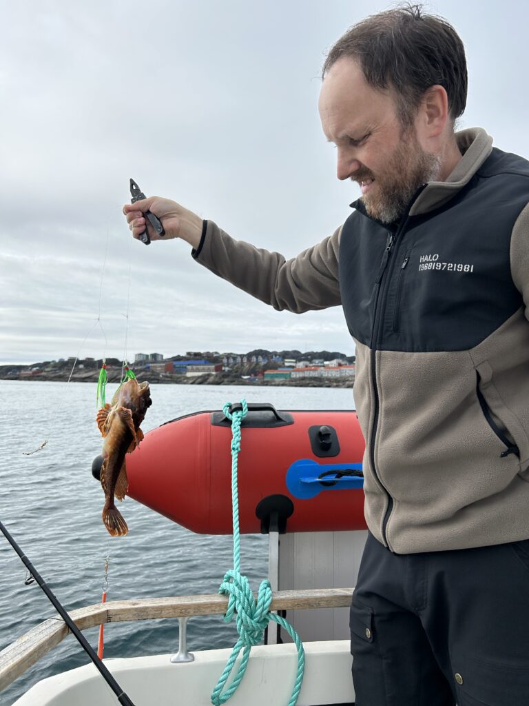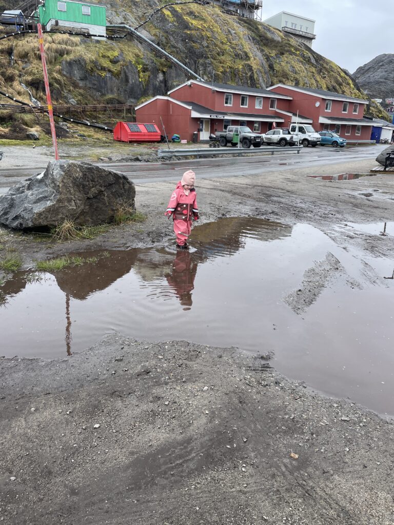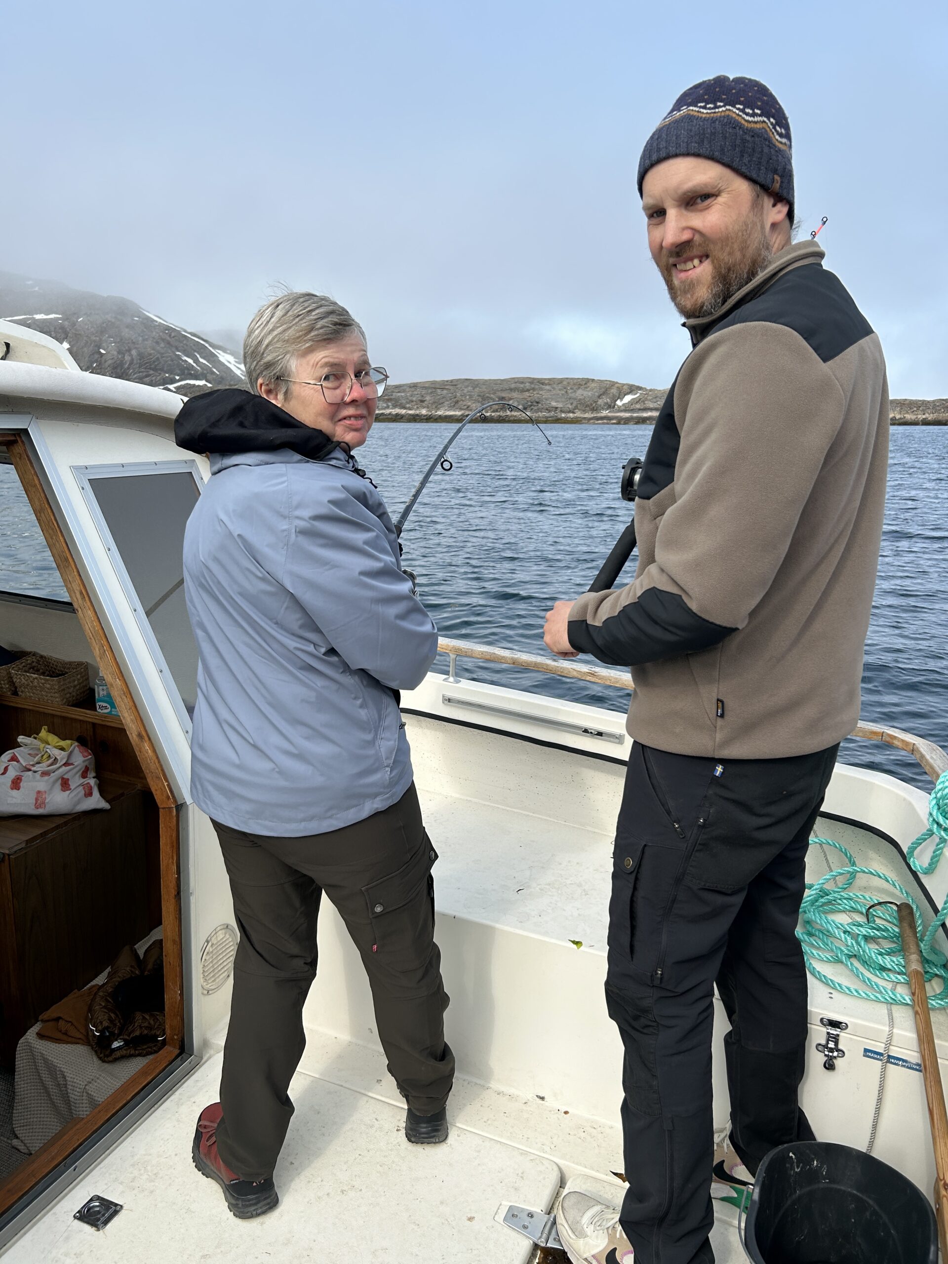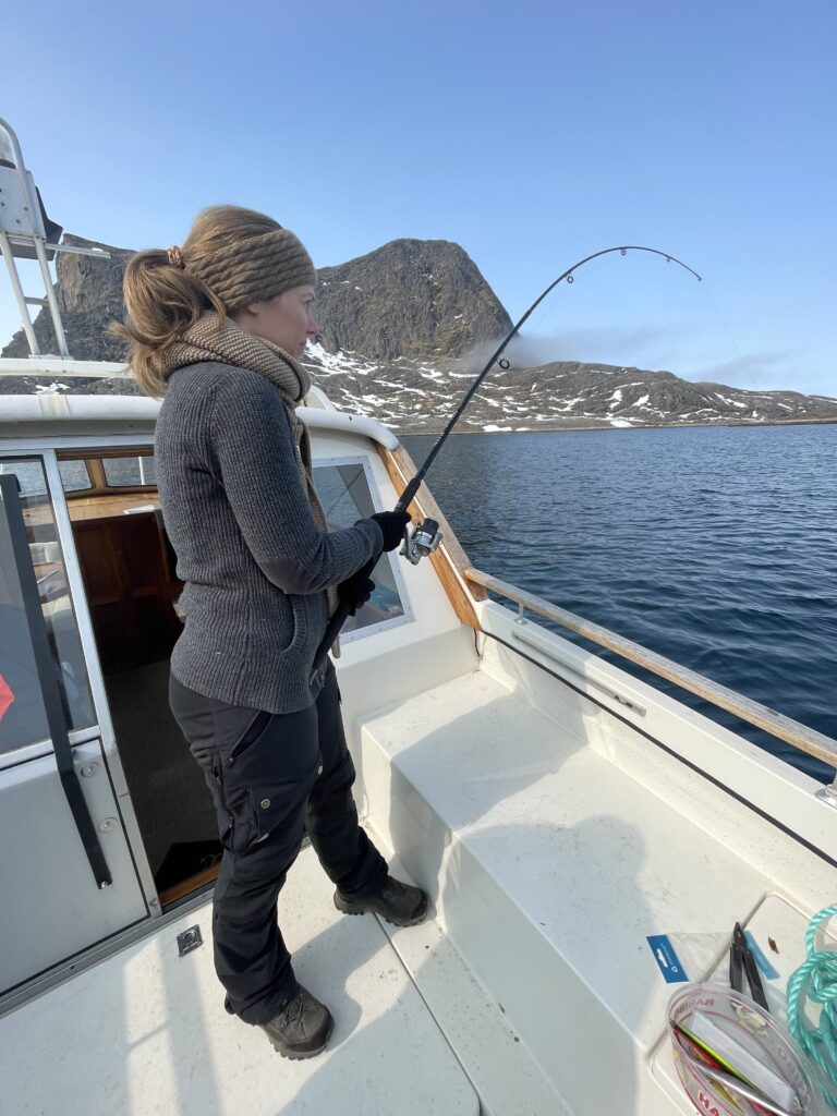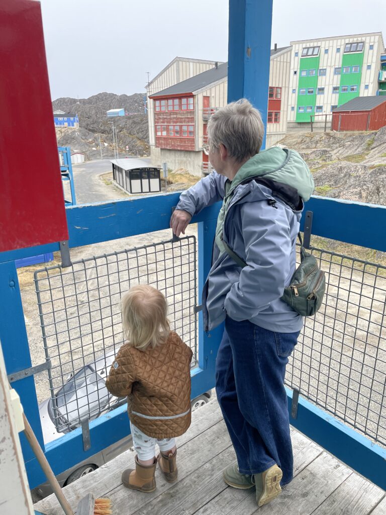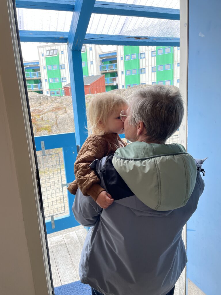 Fisketur.Så er der bid.Alex venter og venter.Bedste skulle også prøve, men……Så kom tågen.My fik en lur på båden.Vigga hyggede med Gurli Gris.Og hygger med mor.Bedste nyder udsigten.Line fangede en havkat.54 cm.Havkatten har vilde tænder.Line fik selv lov til at filetere.Grønlandsk tapas.Pukkelhval hopper ud af vandet.My vil gerne læse.Og Vigga vil gerne danse.Vi siger farvel til Bedste.Tak for denne gang.Farvel mysser.Bedste venter på Taxa.Vigga bygger duplo-tog.Vigga skubber rundt med My, hun synes det er vildt sjovt.Så kom der regn og kæmpe vandpytter.Stormvejr.Så mærkede vi vores første jordskælv.Der er kommet nyt legetøj i hallen.De jagter en hval.Men fik den desværre ikke.Brugseni-løb med gode præmier.Og hygge.Der var endnu større vandpytter.På fisketur igen, her en Ulk på krogen.Line og Vigga får vind i håret.Alex fangede en havkat, 64 cm.