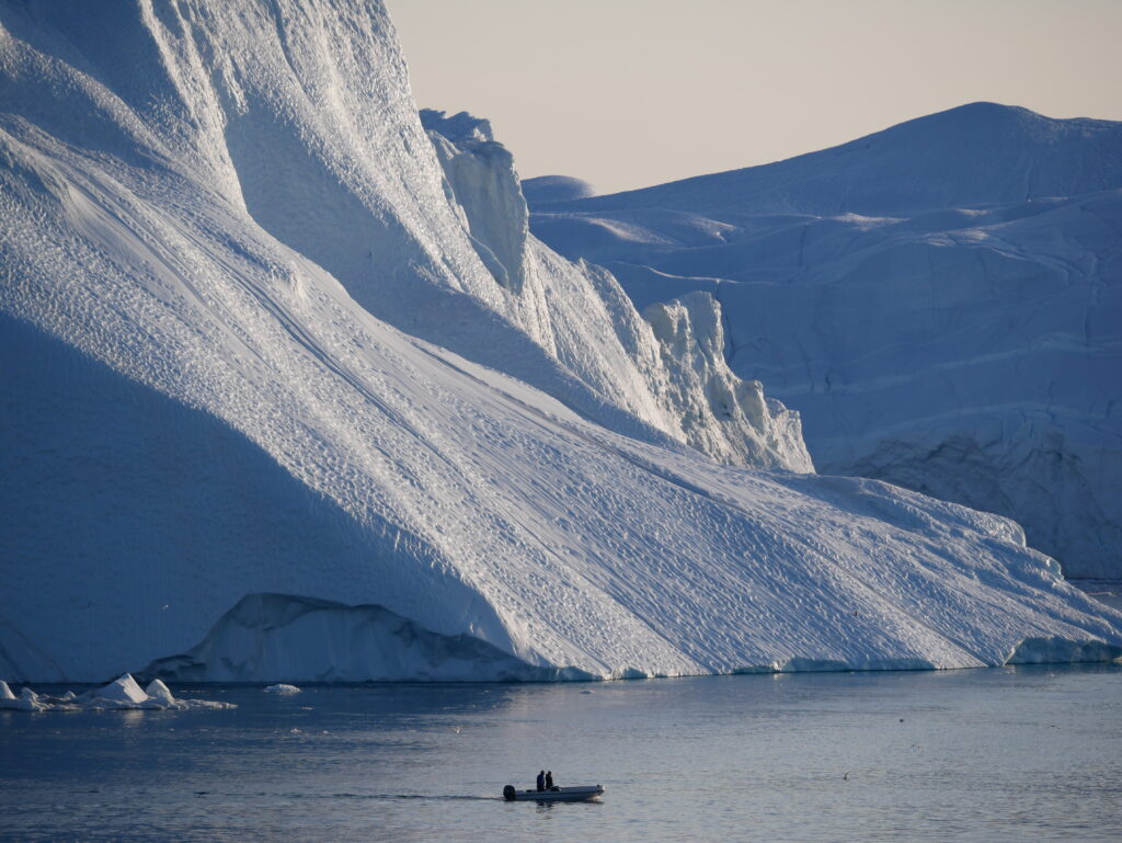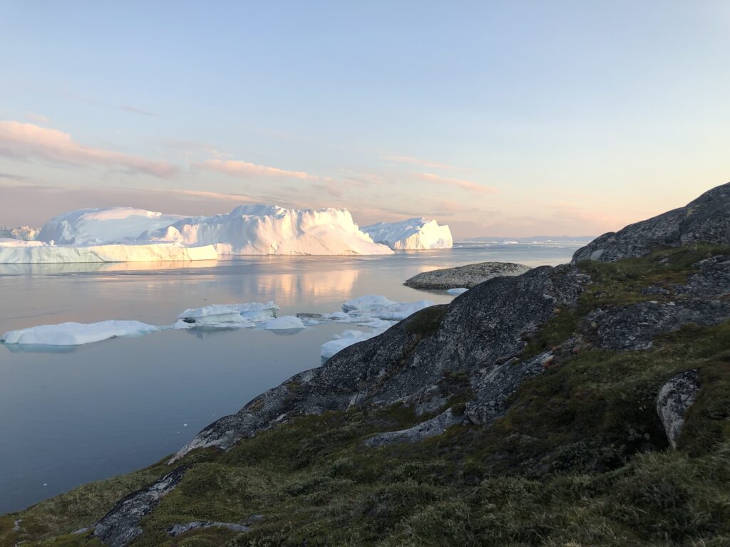 Når solen står helt lavt får isbjergene de flotteste farver.