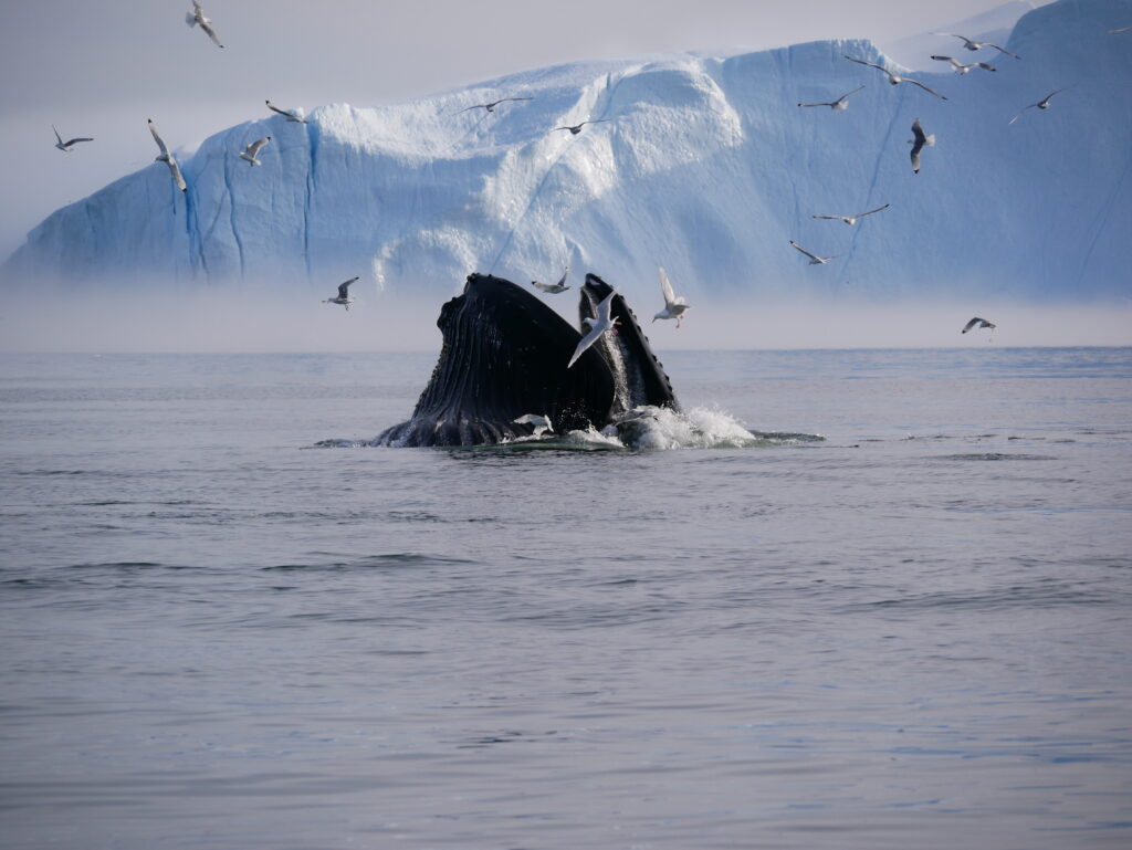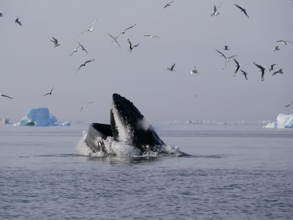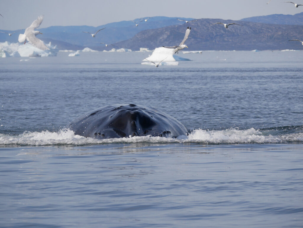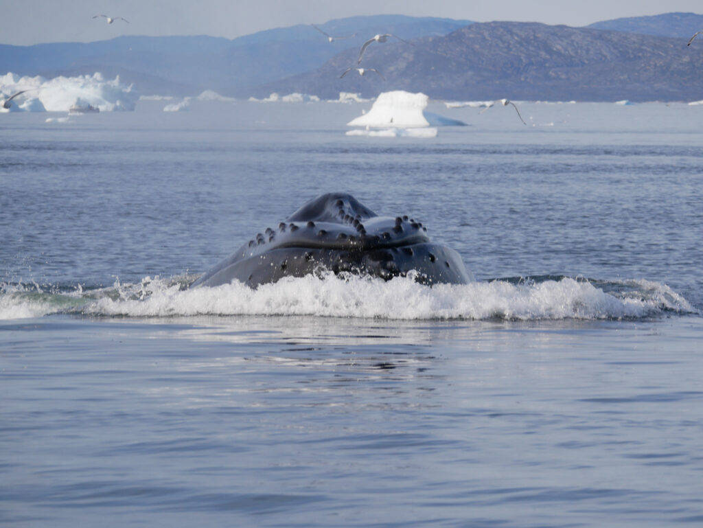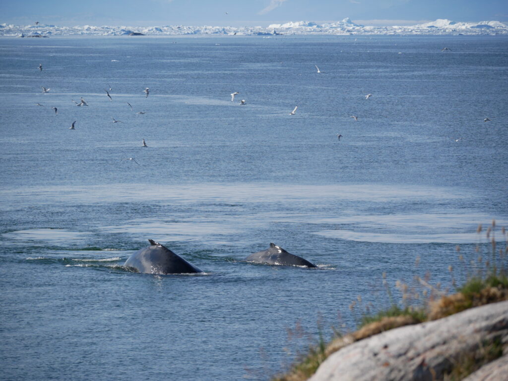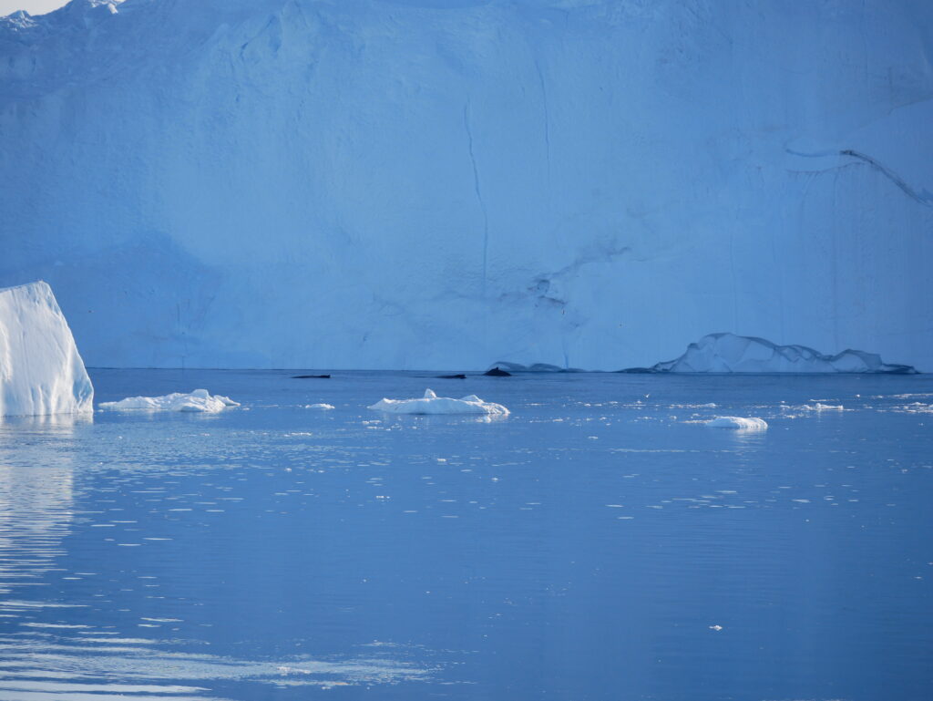 Hvalerne svømmer rundt foran isbjergene.