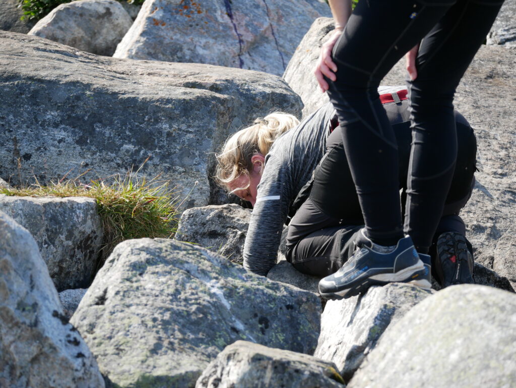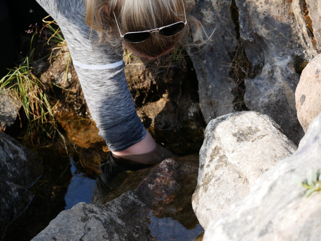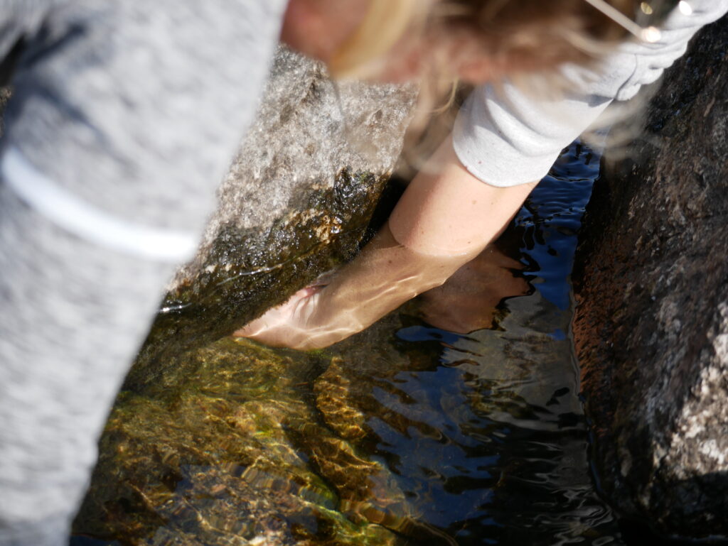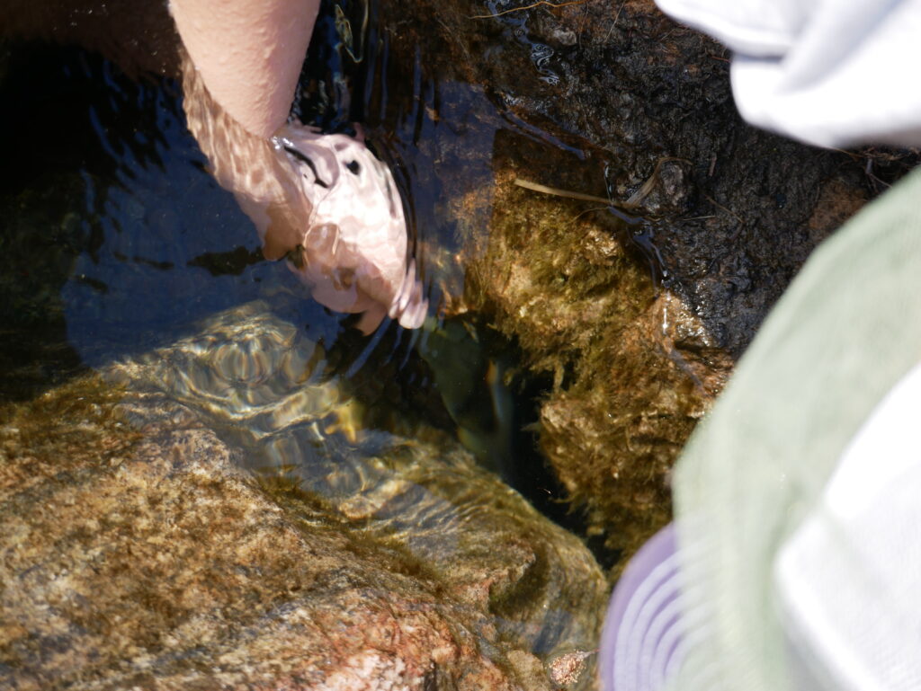 Line prøver at fange en fjeldørred mellem stenene med hænderne.