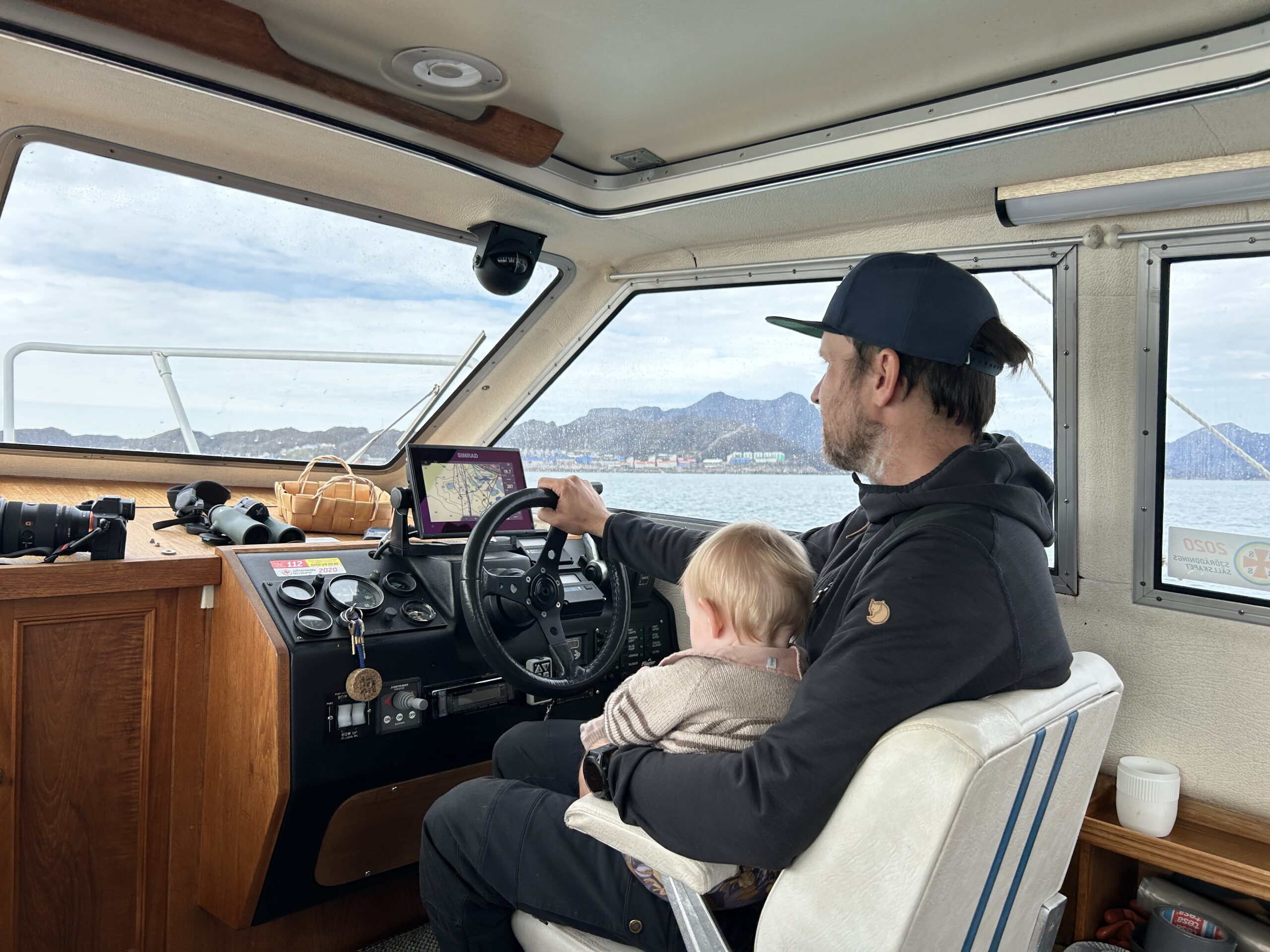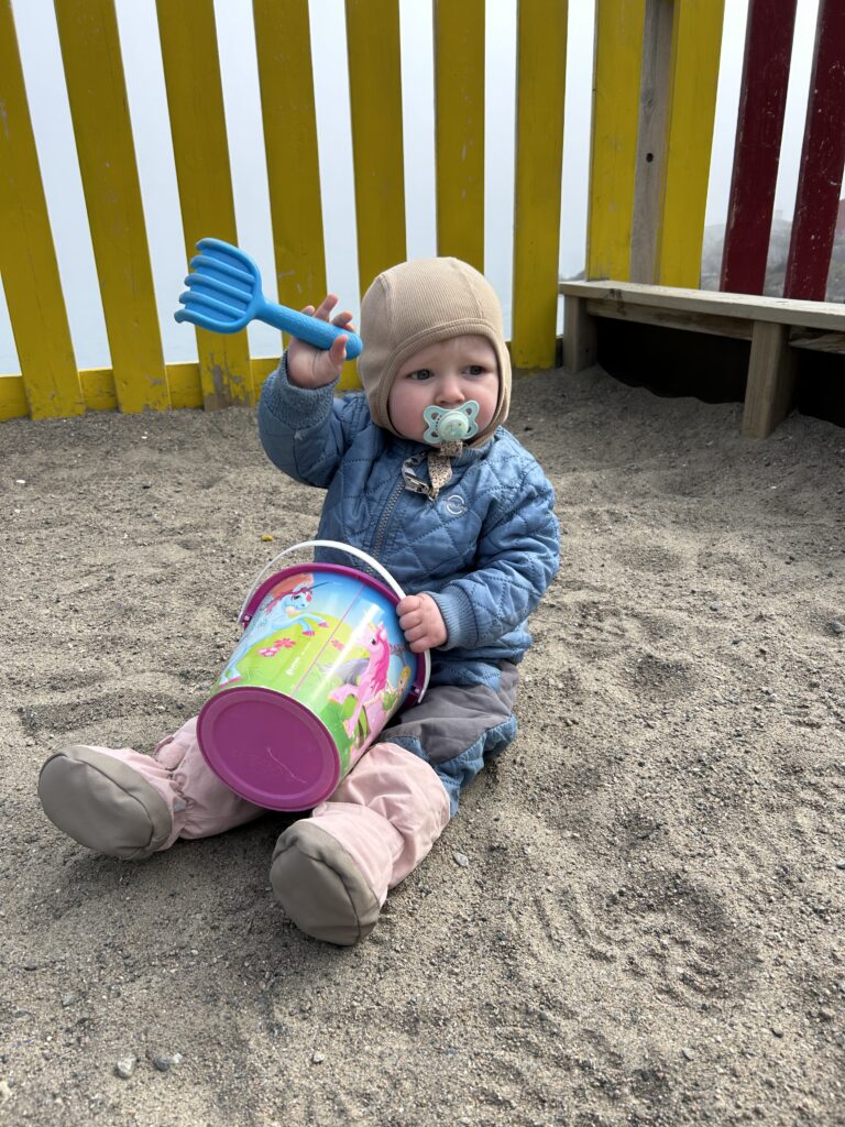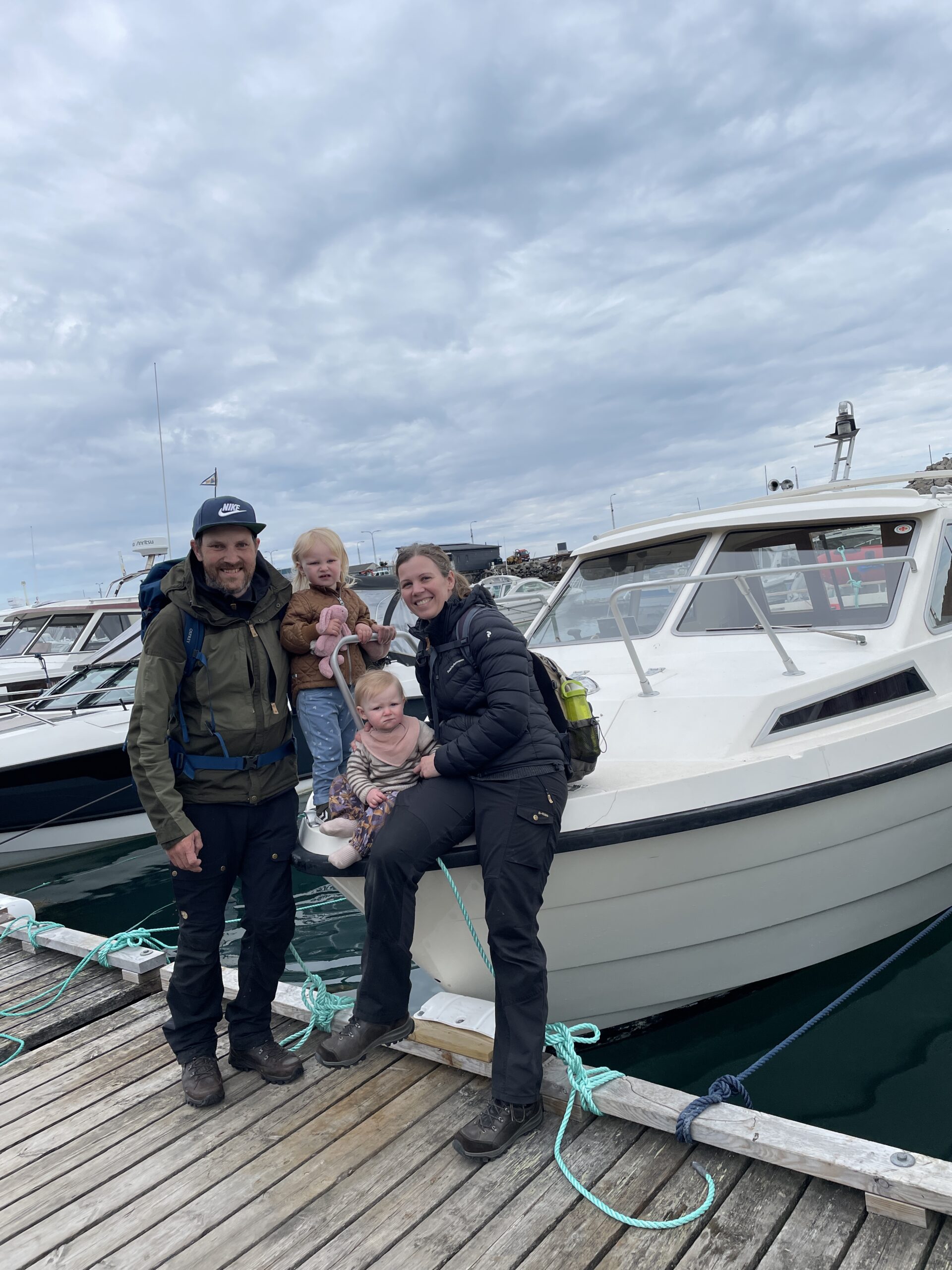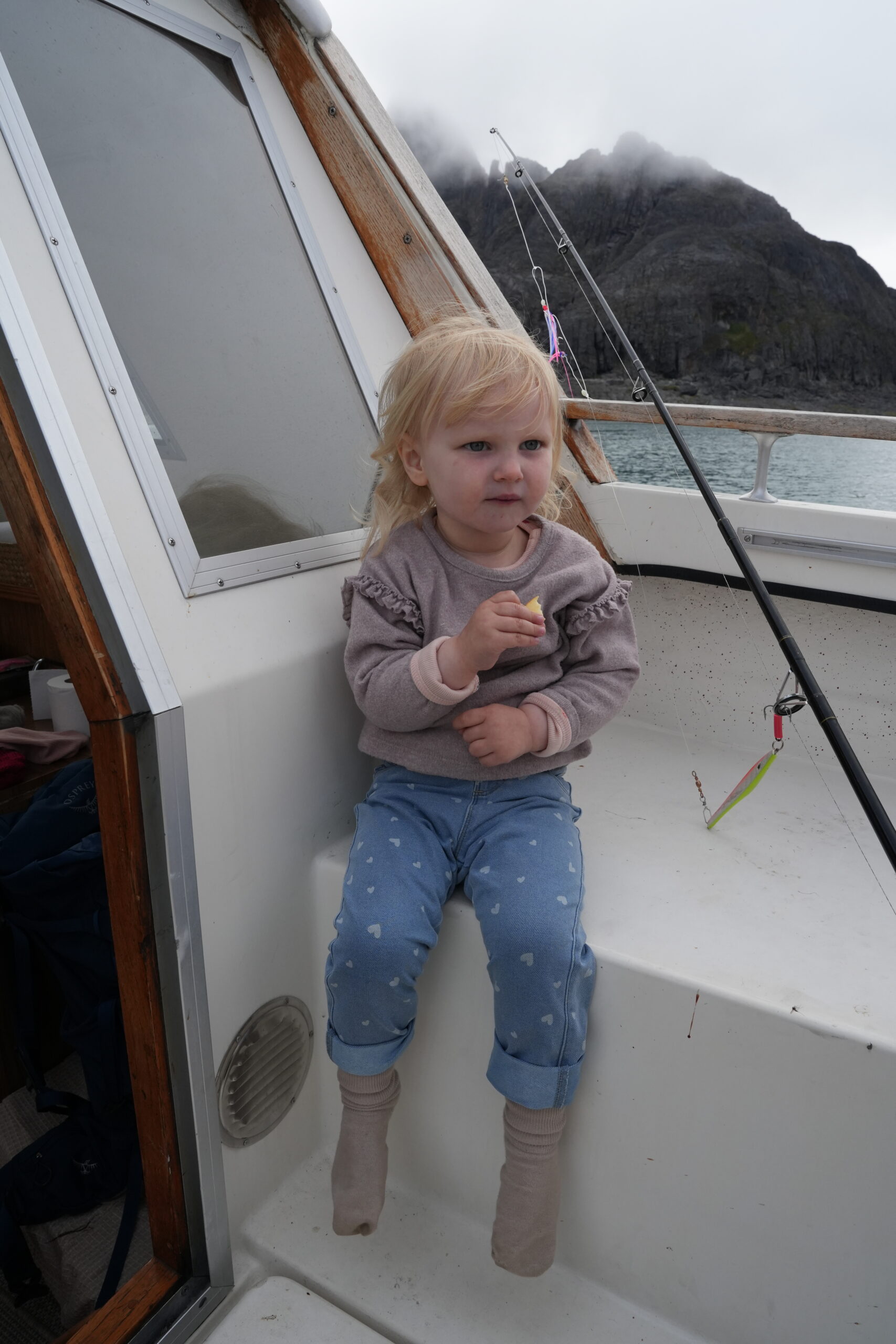 Fælles bad med masser af skum.Endnu et krydstogtskib.Vigga er vild med at lave perler.Vigga bygger endnu et laaaangt tog.My vil også lege.Alex fik sig en stor torsk på dagens sejltur.Torsdag eftermiddag ville vi ud og fange torsk – vi kom lige forbi en hval.Alex gør fiskestængerne klar.Vigga maler.Og Line kigger på.Så fandt vi torskene – Alex fanger to på en gang.Line fanger en flot arktisk ulk.Line tog lige 3 torsk på en gang.My vågnede da vi skulle til at hjem.Og så skulle der leges.Vi laver altså ikke ballade.Det er min sut My!Dagens fangst blev 8 torsk på til sammen 10,4 kg.Der blev skåret til 16 fileter.Og pakket ordentligt ned, så det kan sendes til Danmark.My øver sig i at stå selv – her er hun oppe i 3 sekunder.Fredag drev tågen ud og ind, hvilket gav et flot landskab.Og nogle flotte farver i havet.My leger lidt i sandkassen.Vigga er også med.Hey, jeg er lige her!Hej hej.Vigga gynger.Og leger i legetårnet.My på opdagelse.Flot udsigt fra legepladsen med tåge over havet.Pakket og klar til den sidste sejltur – snøft!Alle på vej ombord.Vi får os lige en lille formiddagskage.Alex styrer som altid.Skal bare lige hen til Hjertefjeldet.Vigga putter og maler.Og lægger puslespil.Første fisk er på.Endnu en fin torsk.Vigga var lige ude og se det hele gik, som det skulle.Der var flot tåge omkring fjeld toppene først på dagen.Lidt udsigt, mens der fiskes bag på båden.Udsigt mod nord.Hjertefjeldet.Så er My vågen.Og der er frokost til alle.Så er det Viggas tur til en lur.Alex renser de 5 torsk, vi fangede.My leger.Og gemmer sig. Mens Vigga sover.Så går det hjem af for sidste gang.Vi tog lige en tur rundt om byen.Hotellet til venstre og kirken i midten.Mere af Maniitsoq.Perfekt sejl vejr.“Vores” ende af byen.Kirke bugten.Selfie foran båden.Vi takker for den sidste sejltur.Dagens fangst skal også laves til fileterSmuk tåge søndag morgen.Et par ravneTågen driver stille væk.Så er båden afleveret til dens nye ejere.Sidste farvel til båden, da den sejler til Nuuk.Vores bådtrailer blev solgt for kolde kontanter.Så begynder nedpakningen.