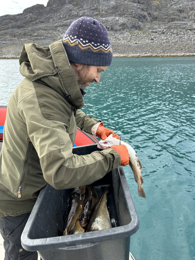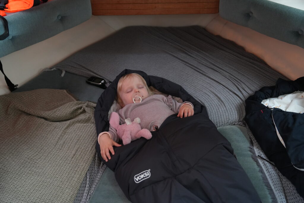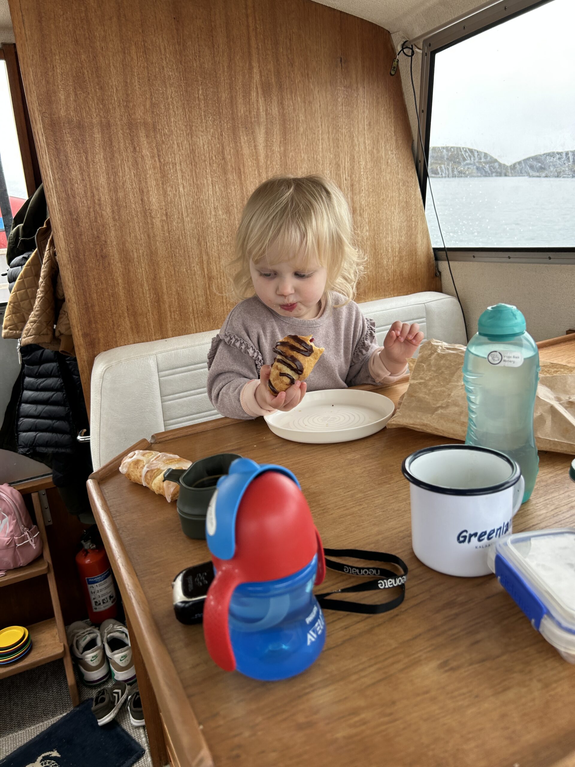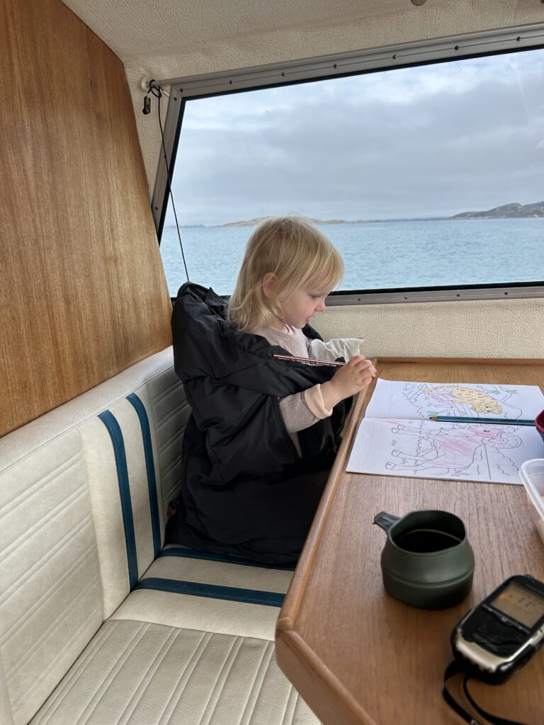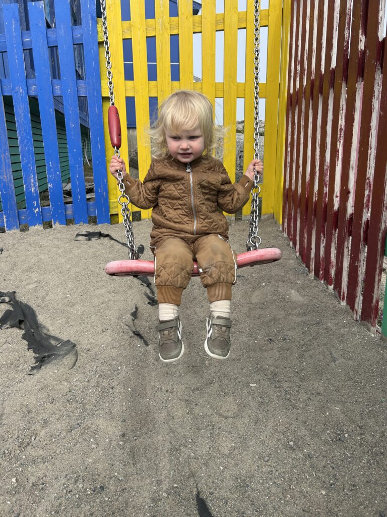 Fælles bad med masser af skum.Endnu et krydstogtskib.Vigga er vild med at lave perler.Vigga bygger endnu et laaaangt tog.My vil også lege.Alex fik sig en stor torsk på dagens sejltur.Torsdag eftermiddag ville vi ud og fange torsk – vi kom lige forbi en hval.Alex gør fiskestængerne klar.Vigga maler.Og Line kigger på.Så fandt vi torskene – Alex fanger to på en gang.Line fanger en flot arktisk ulk.Line tog lige 3 torsk på en gang.My vågnede da vi skulle til at hjem.Og så skulle der leges.Vi laver altså ikke ballade.Det er min sut My!Dagens fangst blev 8 torsk på til sammen 10,4 kg.Der blev skåret til 16 fileter.Og pakket ordentligt ned, så det kan sendes til Danmark.My øver sig i at stå selv – her er hun oppe i 3 sekunder.Fredag drev tågen ud og ind, hvilket gav et flot landskab.Og nogle flotte farver i havet.My leger lidt i sandkassen.Vigga er også med.Hey, jeg er lige her!Hej hej.Vigga gynger.Og leger i legetårnet.My på opdagelse.Flot udsigt fra legepladsen med tåge over havet.Pakket og klar til den sidste sejltur – snøft!Alle på vej ombord.Vi får os lige en lille formiddagskage.Alex styrer som altid.Skal bare lige hen til Hjertefjeldet.Vigga putter og maler.Og lægger puslespil.Første fisk er på.Endnu en fin torsk.Vigga var lige ude og se det hele gik, som det skulle.Der var flot tåge omkring fjeld toppene først på dagen.Lidt udsigt, mens der fiskes bag på båden.Udsigt mod nord.Hjertefjeldet.Så er My vågen.Og der er frokost til alle.Så er det Viggas tur til en lur.Alex renser de 5 torsk, vi fangede.My leger.Og gemmer sig. Mens Vigga sover.Så går det hjem af for sidste gang.Vi tog lige en tur rundt om byen.Hotellet til venstre og kirken i midten.Mere af Maniitsoq.Perfekt sejl vejr.“Vores” ende af byen.Kirke bugten.Selfie foran båden.Vi takker for den sidste sejltur.Dagens fangst skal også laves til fileterSmuk tåge søndag morgen.Et par ravneTågen driver stille væk.Så er båden afleveret til dens nye ejere.Sidste farvel til båden, da den sejler til Nuuk.Vores bådtrailer blev solgt for kolde kontanter.Så begynder nedpakningen.