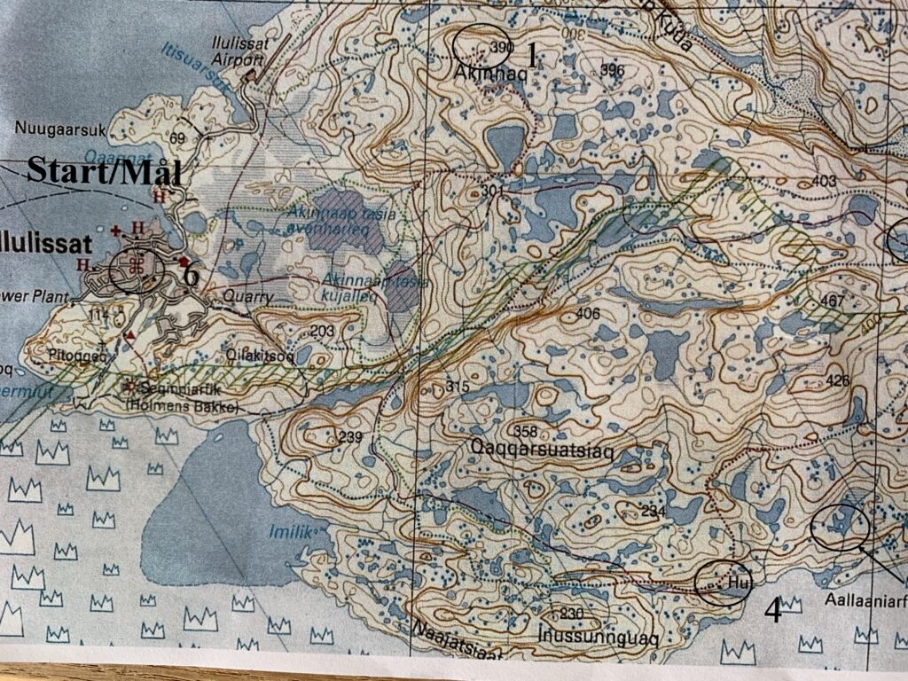 Lørdag var planen at vandre til toppen af Inussunnguaq fjeldet. Der er ingen mobil dækning så kortet er med.
