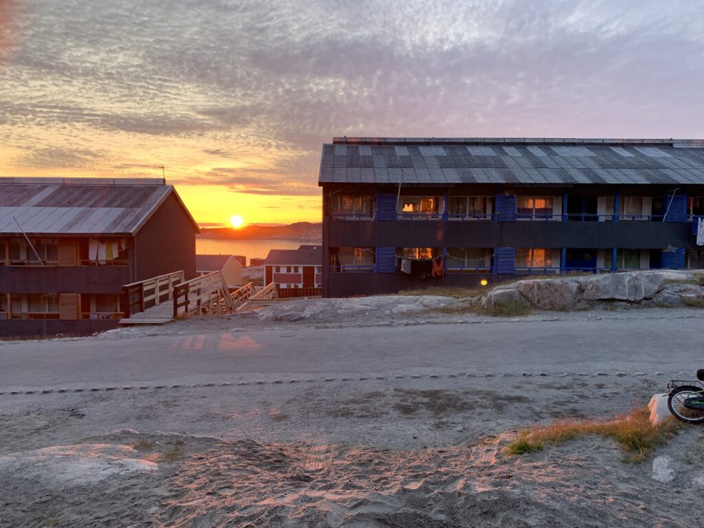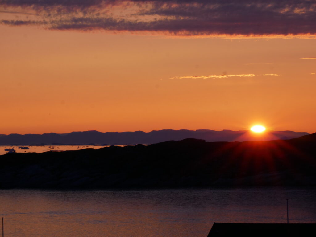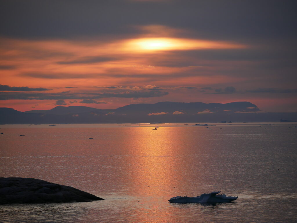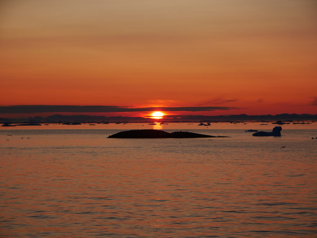 Smuk solnedgang med Diskoøen som baggrund.