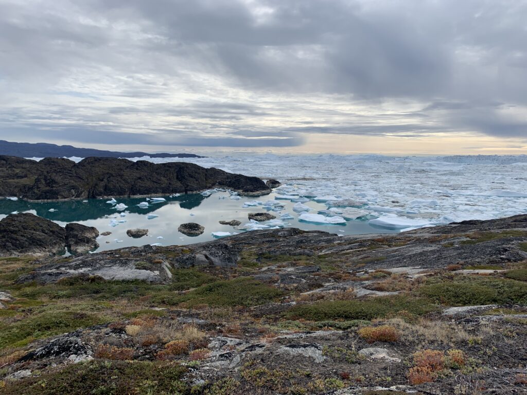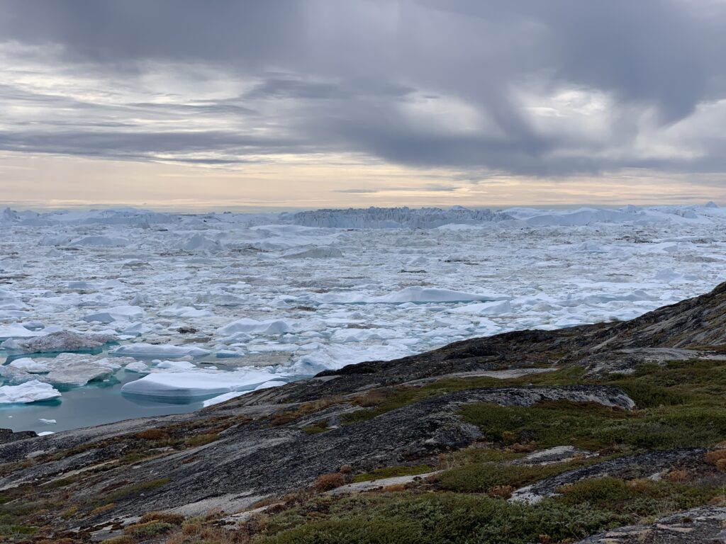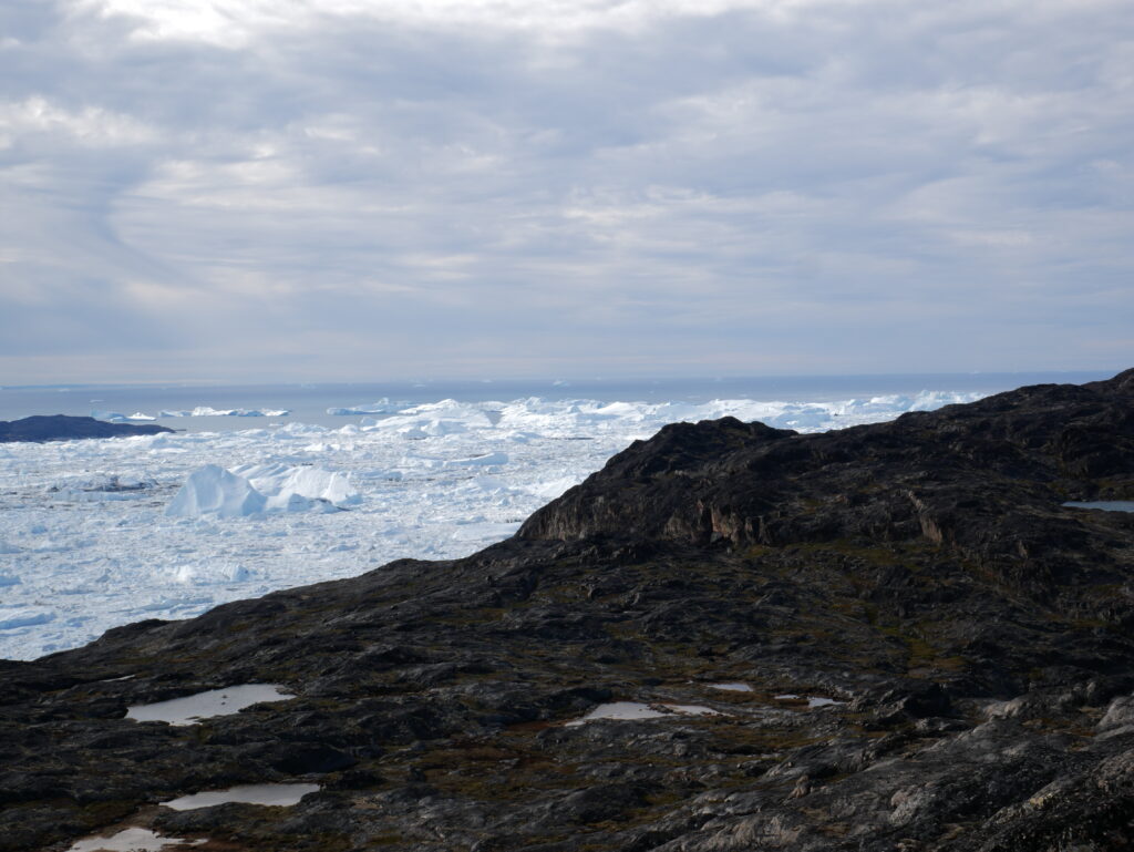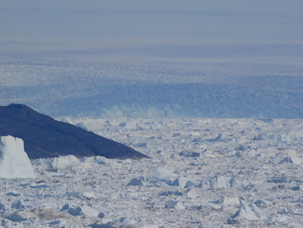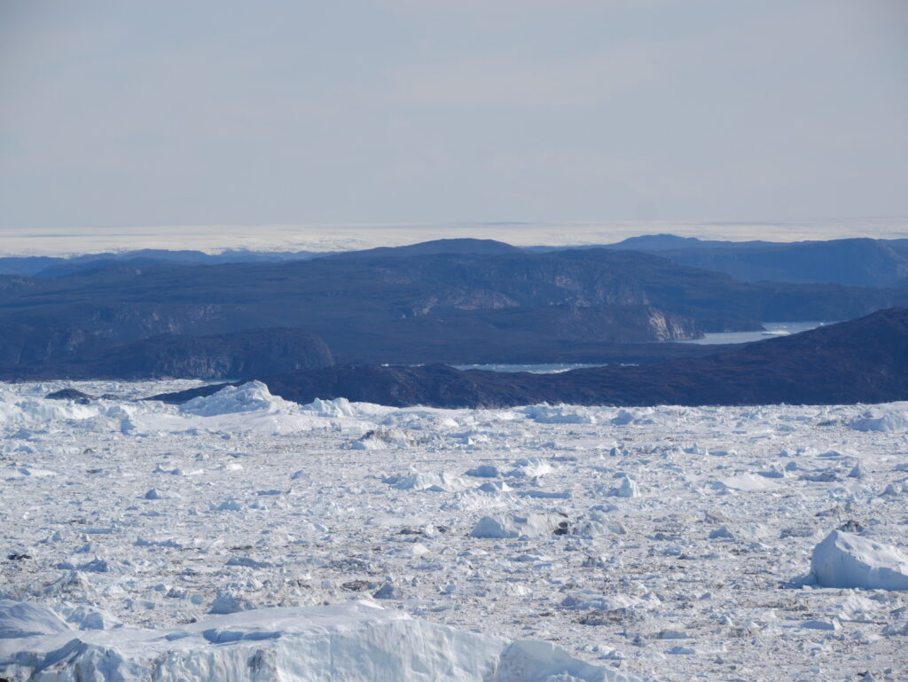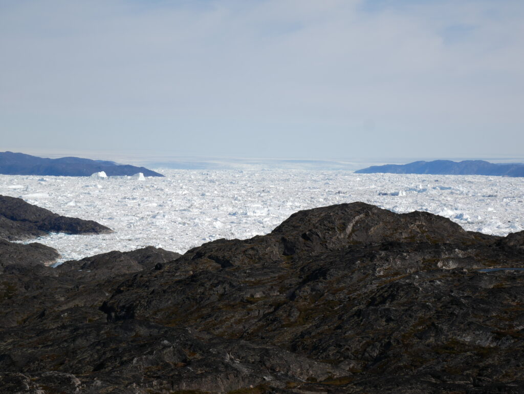 Kigger man i den modsatte retning kan man se mundingen af isfjorden, hvor de store isbjerge er gået på grund.