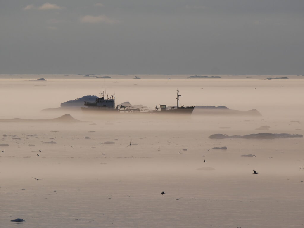 Et gammelt skib kommer ind gennem tågen.