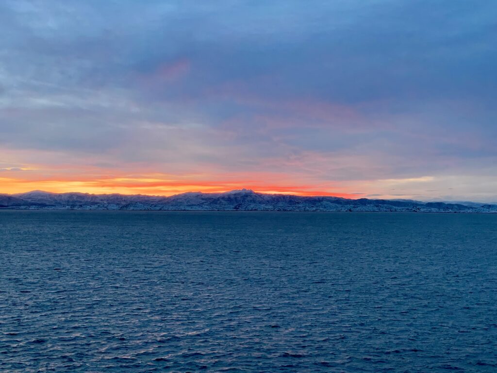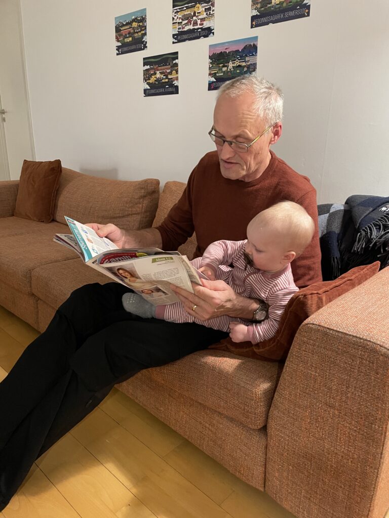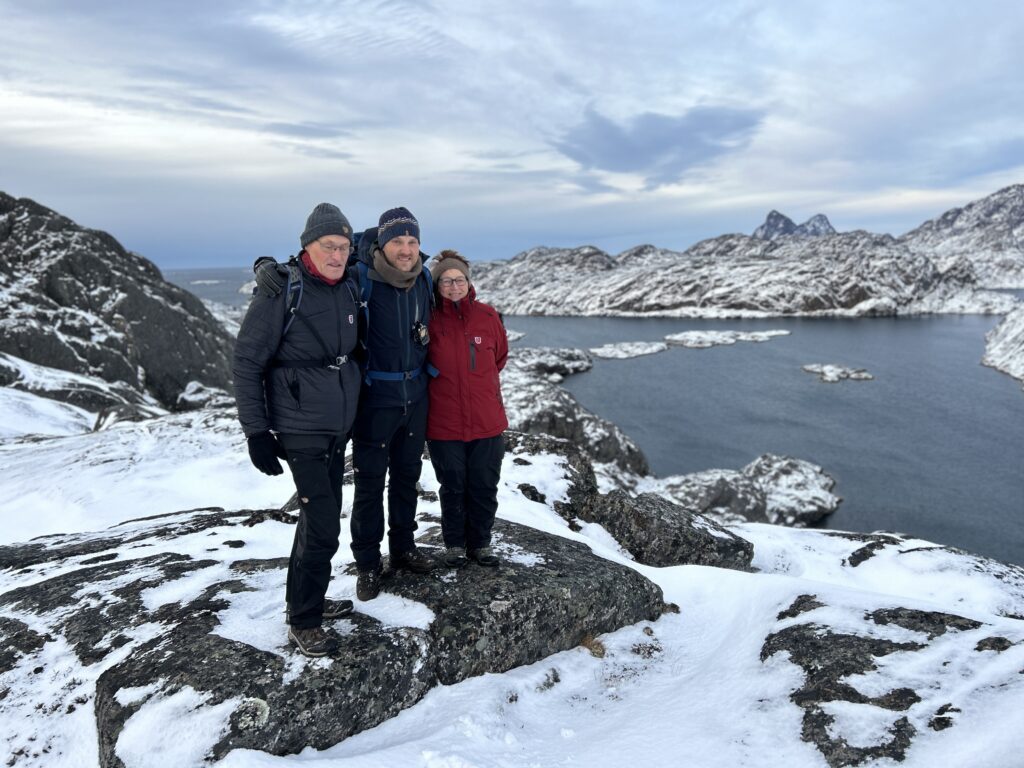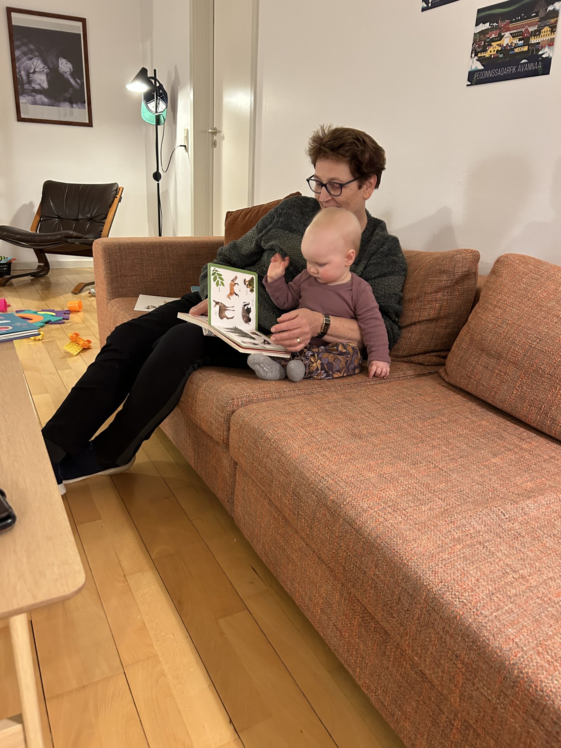 Mandag d. 30. oktober blev Vigga 10 månederSolopgangene er virkeligt flotte for tiden.De er lidt forskellige hver eneste dag.Et lille kig ind i en af de mange bugter i Maniitsoq.Og endnu en solopgangSolnedgangene kan også noget.Torsdag landede Farmor og Farfar i Maniitsoq.Lørdag kom sneen retur efter en uge som havde flere dage med 7-9 graders varme.Der blev leget og læst.Vigga viser lige Farmor sin fine bog.Der blev også tid til lidt afslapning.Søndag stod den på vandretur i fjeldet.Familie billede i fjeldet.