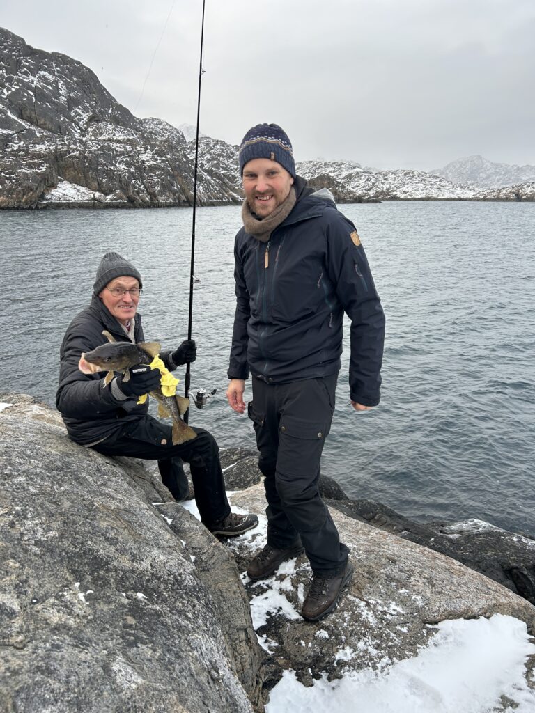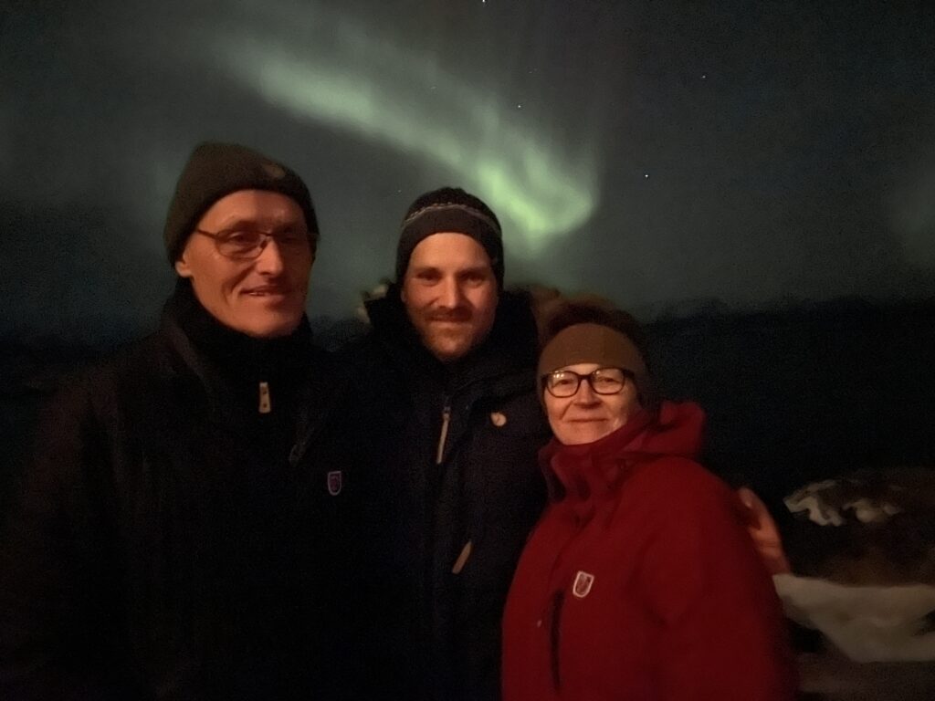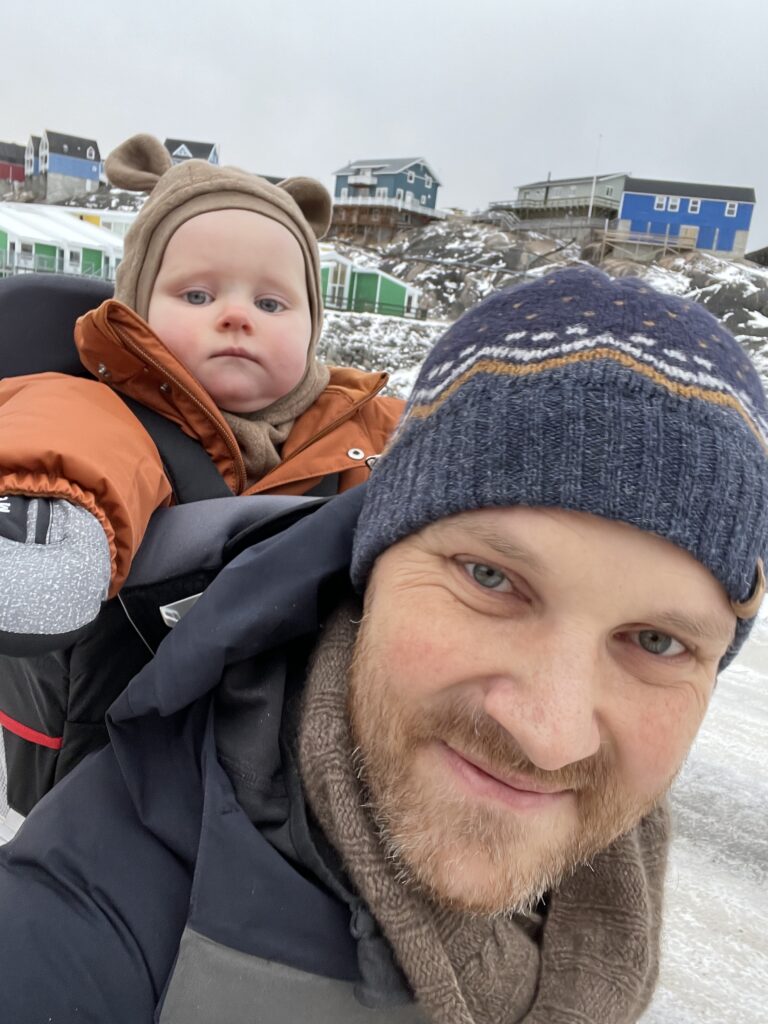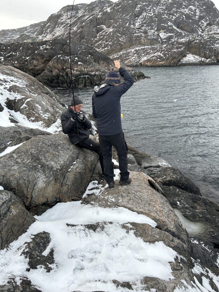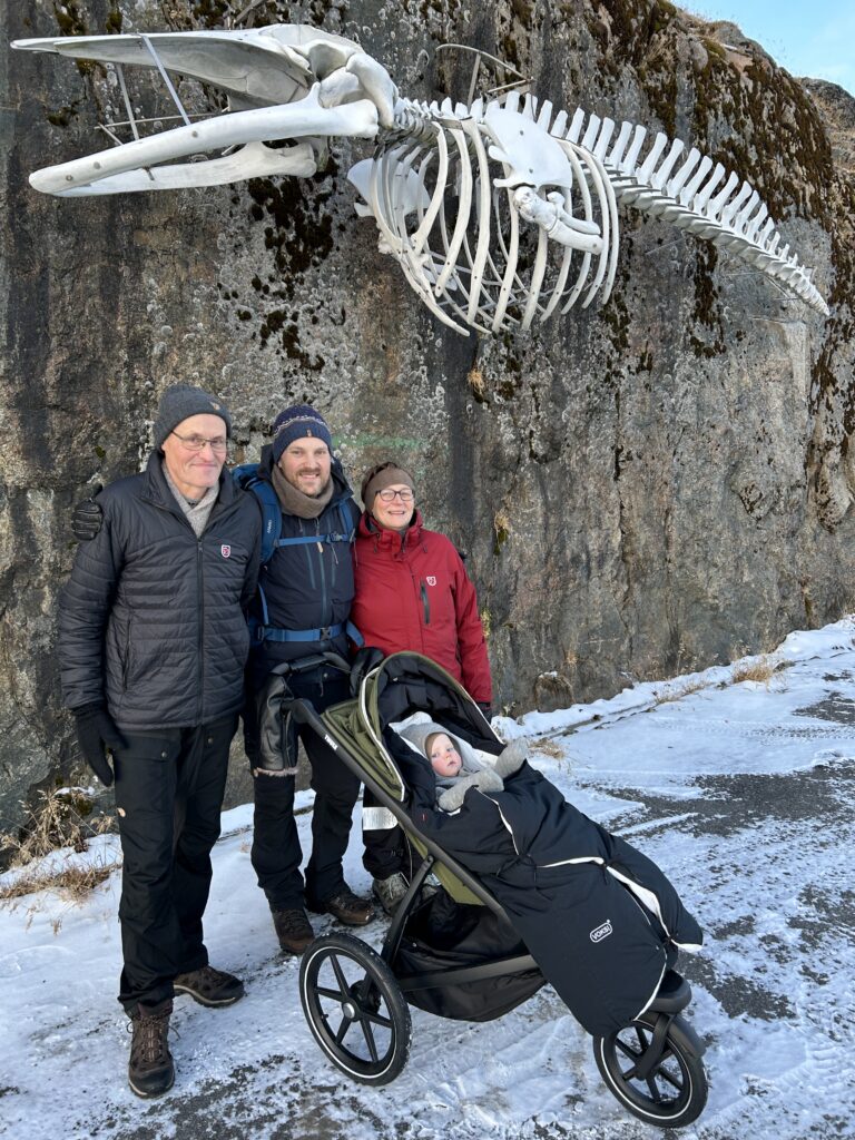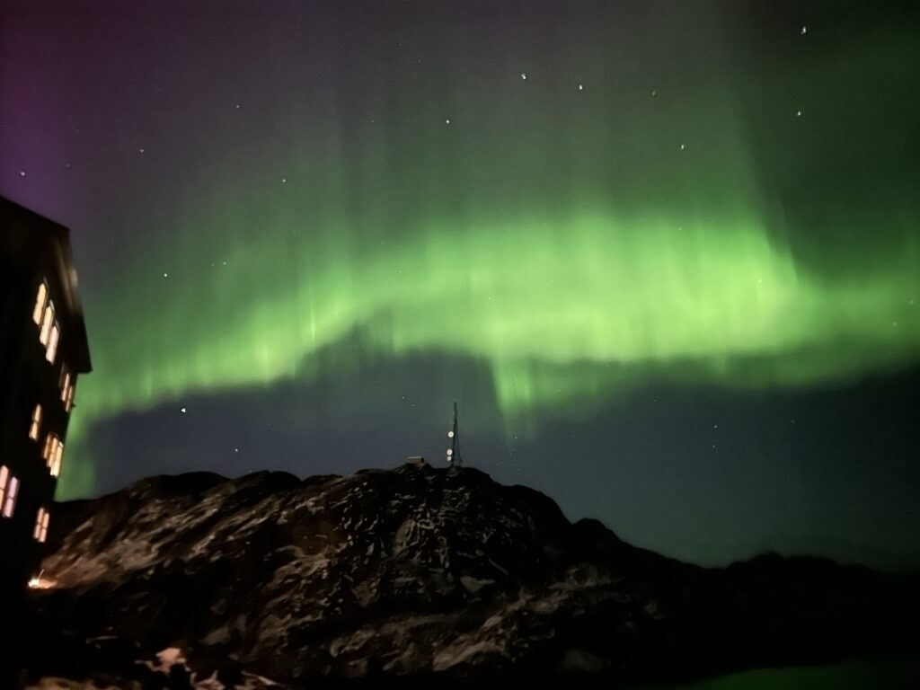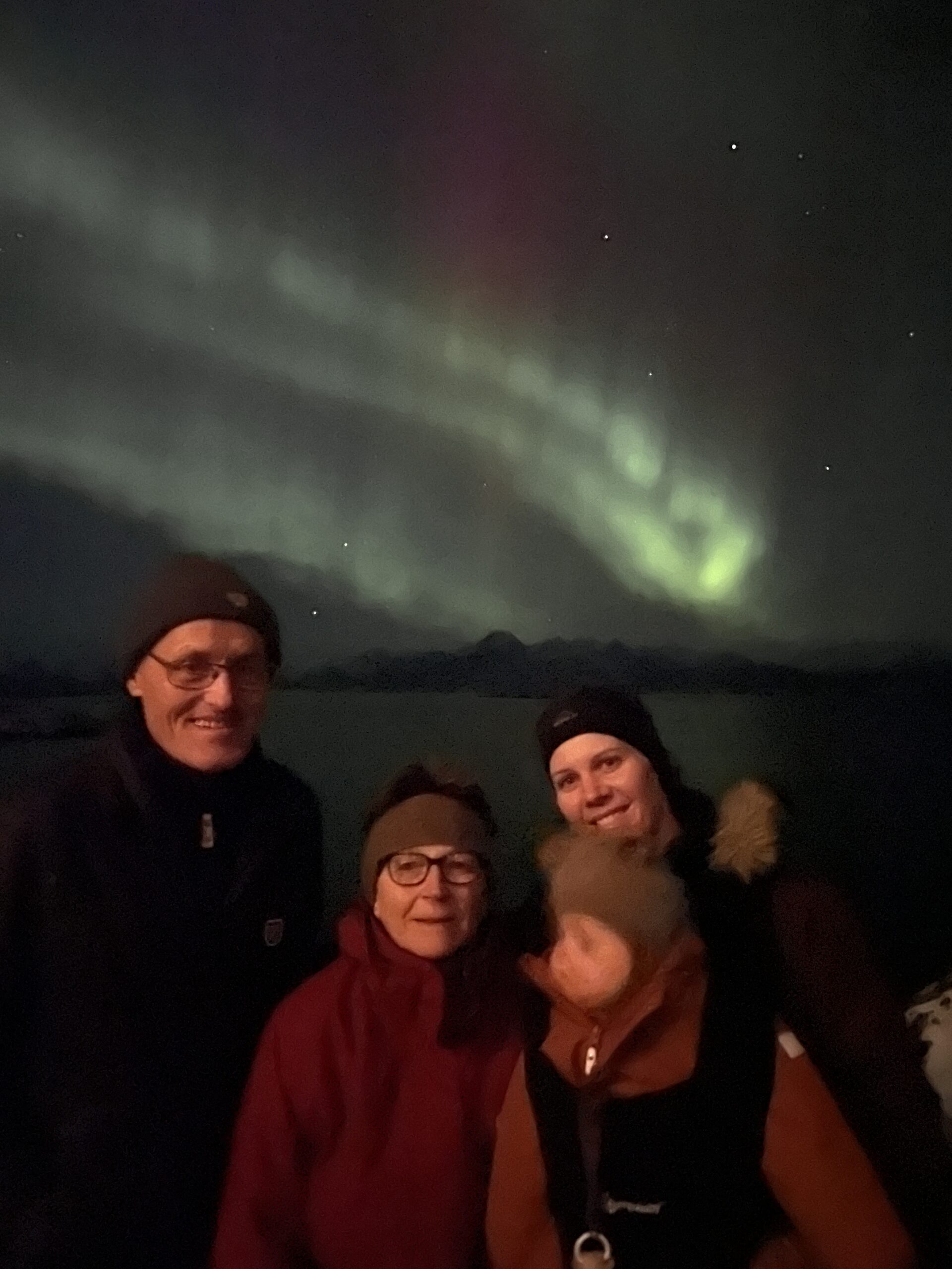 Vigga læser blade med Farmor og FarfarMandag aften var der tændt for et flot nordlys.Nordlyset startede tidligt, så Vigga var med Farmor og Farfar ude at se nordlys.Familien Møberg under nordlyset.Mere nordlys.Tirsdag gik Herluf og Alex til toppen af “Eiffeltårnet”Herluf nyder udsigten.Det var en lidt rå kold dag på toppen.Alex og Vigga på vej hjem fra en lille gå tur med Farmor og Farfar.Flotte farver lige omkring solnedgang.Herluf med sin anden torsk.Onsdag aften stod den på sæl, denne gang som wienersnitzel.Lidt panering og sælen ligner næsten en kalvesnitzel.Paneret stegt sæl smager faktisk ret godt.Vores faste hval uden for vores vinduer er taget videre. Til gengæld kommer der mange havørne forbi.Havørnene er ikke så gode venner med ravnene.En tur på hotellet til aftensmad og grøndlandsk kaffe.Nordlys ved hvalspottet.Fredag var vi alene på en længere vandretur i fjeldet.Line i det flotte vejr.Udsigten ind i fjorderne.En flot frosset bæk.Lidt mere nordlys fredag aften.Lørdag var Anni, Herluf og Alex på vandretur i blomsterdalen.En frosset sø i fjeldet på vej til blomsterdalen.Et lille frosset vandfald.Farfar og Vigga leger på gulvet.Så er der bid igen.Herluf skulle lige nå at fange en torsk mere inden turen går mod Danmark.Det blev til en flot torsk på 64 cm.Udsigt ind over havnen med kirken og hotellet på toppen.Vi siger tak for et dejligt besøg til Farmor og Farfar.